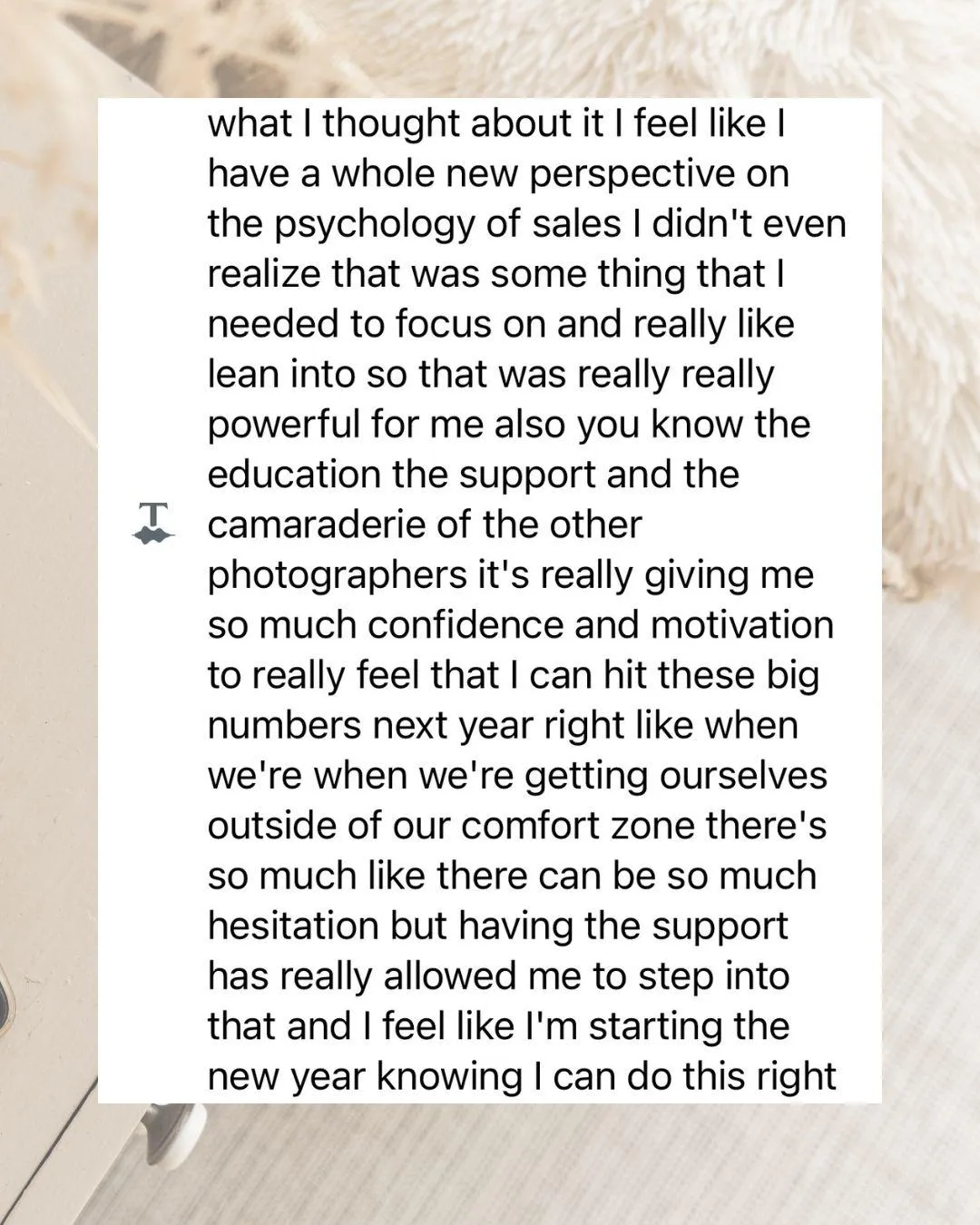 Her systems, scripts, and methods have helped me reach a 6 figure portrait studio business. Not only is she the best cheerleader ever, her business sense is spot on. She invests so much into her own education as an industry leader and is more than generous with her knowledge and time.