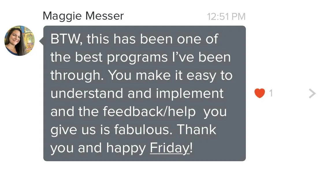 I loved the weekly calls and being able to ask questions to her and the other women also taking the coaching course. I highly recommend this!“